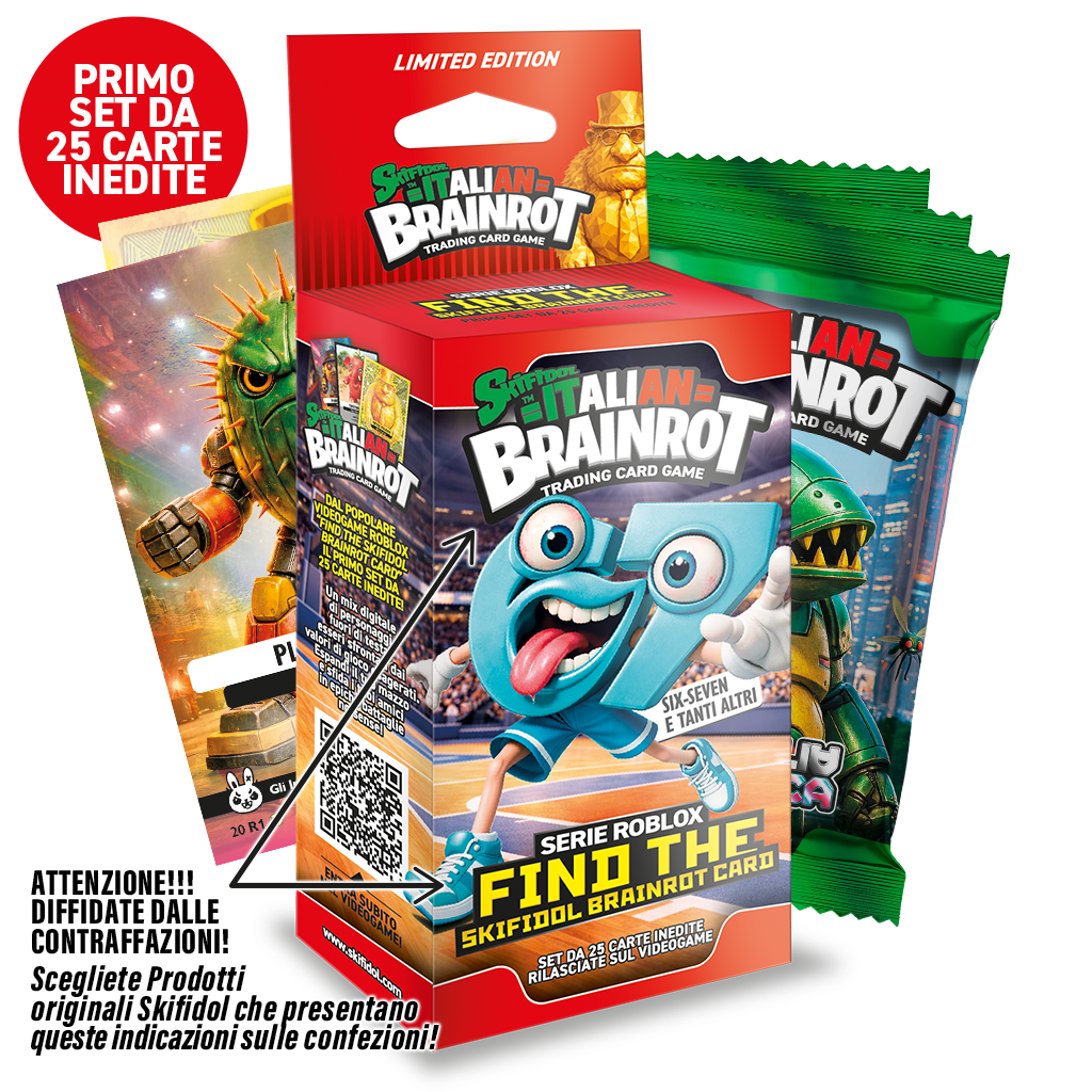 Dal videogame Roblox “Find The Skifidol Brainrot Card”, in edicola 50 nuove carte Skifidol Italian Brainrot™ in due set esclusivi. All’interno di ciascun set: 25 carte da gioco inedite – in edizione limitata – rilasciate sul videogame e 14 carte da gioco serie Gamma. Espandi il tuo mazzo, completa la collezione e sfida i tuoi amici in epiche battaglie… no-sense!!! In tutte le edicole con la nuova rivista Officina Edicola. GLI ORIGINALI SKIFIDOL ITALIAN BRAINROT SONO SOLO SKIFIDOL!